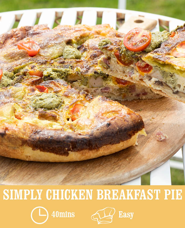 The bright colours from the cherry tomatoes and pesto makes this simply chicken breakfast pie the star centre piece of any picnic!